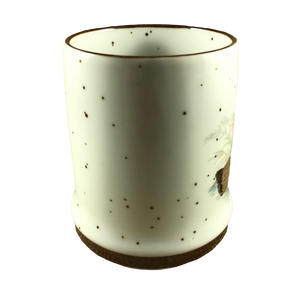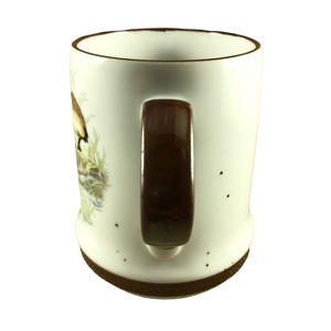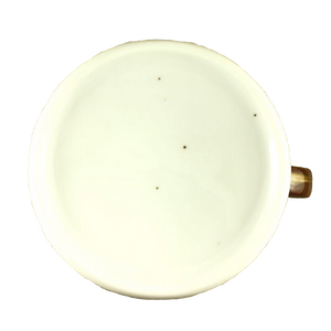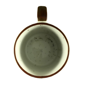 Also features a brown handle and matching band around the bottom of the mug and on the top rim.