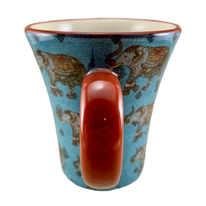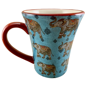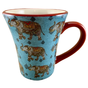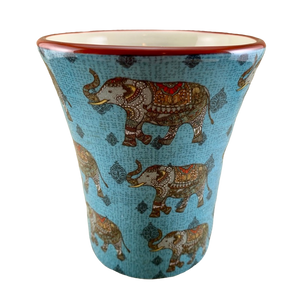 Features a repeating pattern of elephants against. blue background wrapping around its exterior surface.