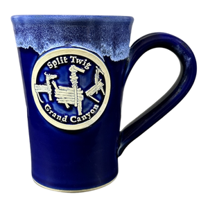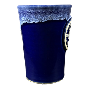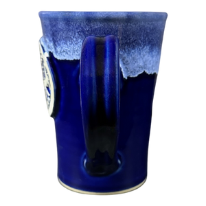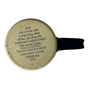 This is a tall pottery style mug that features a raised plaque on its front surface with 3 images of split twig figurines.