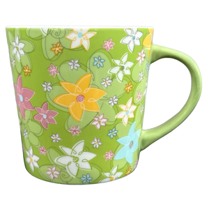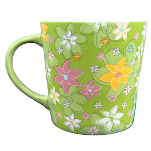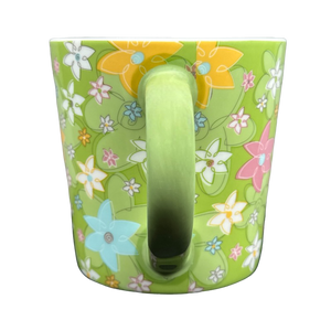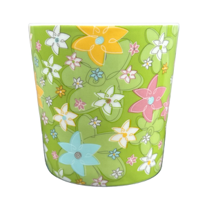 Features a beautiful floral pattern wrapping around its exterior surface with a coordinating green handle.