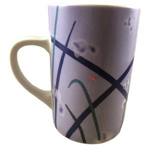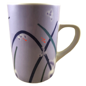 This mug has no cracks, scratches or crazing. There are some tiny white nicks on the front and rear surface. Please see the red arrows pointing to these in the 1st and last photos.