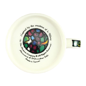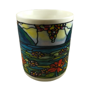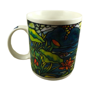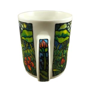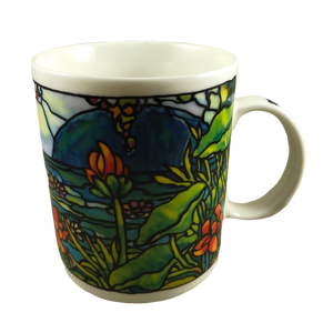 Features artwork wrapping around the mug in a Tiffany stained glass style depicting a floral scene.