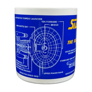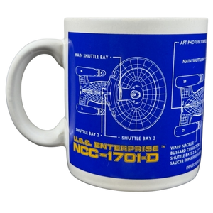 This mug showcases three schematic illustrations of the U.S.S. Enterprise NCC-1701-D encircling its exterior. The front bears the inscription "STAR TREK THE NEXT GENERATION," while the lower left on the back features "U.S.S. ENTERPRISE NCC-1701-D."