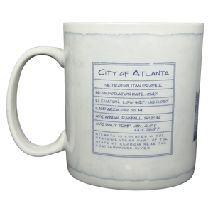 On the reverse side, the “City of Atlanta Metropolitan Profile” offers a classic reference-style panel with key details such as the city’s incorporation year, elevation range, land area, annual rainfall, and average temperatures. A brief note about Atlanta’s location near the Chattahoochee River further enhances its documentary charm. The handle features “Starbucks” vertically printed in matching blue, giving the mug a clean, cohesive branded accent.