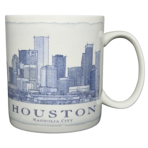 This 2006 Starbucks Houston “Magnolia City” mug showcases a beautifully detailed, architectural-style illustration of the Houston skyline, wrapping elegantly around the mug in rich blue linework. The design captures Houston’s iconic downtown towers rising above the urban landscape, giving the piece a classic map-engraving feel that reflects the city’s bold and ever-growing character. “Houston” and “Magnolia City” are printed along the lower edge in a refined serif typeface, adding an elegant, historic touch.