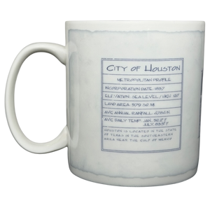 On the back, a framed metropolitan profile provides key facts about the City of Houston, including its incorporation year, land area, elevation, rainfall, and average temperatures. Beneath the stats is a brief geographic description noting Houston’s location in southeastern Texas near the Gulf of Mexico. The handle features a vertical “Starbucks” imprint, tying the piece into the early Starbucks City Mug series sought after by collectors.