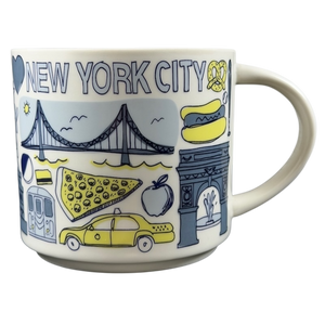 This mug showcases iconic visuals of New York City encircling its exterior. The phrase "NEW YORK CITY" is elegantly displayed on the front upper area, while "STARBUCKS" is subtly printed vertically near the handle on the back.