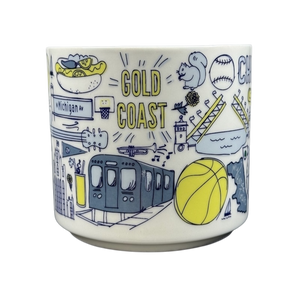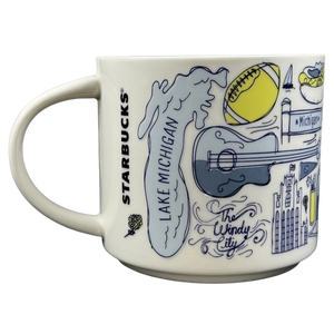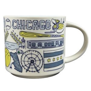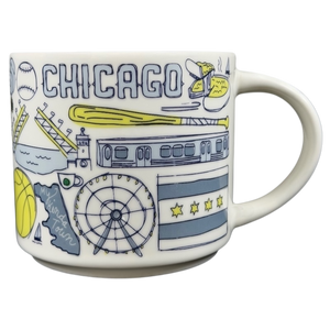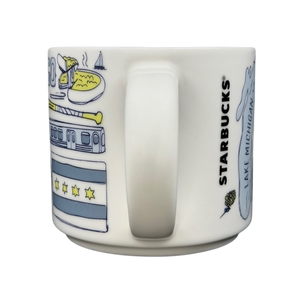This mug showcases a series of images inspired by Chicago encircling its exterior. The word "CHICAGO" is elegantly displayed on the front near the top, while "STARBUCKS" appears vertically along the back close to the handle.