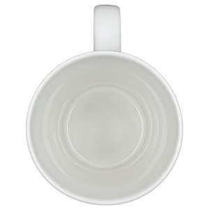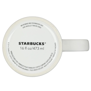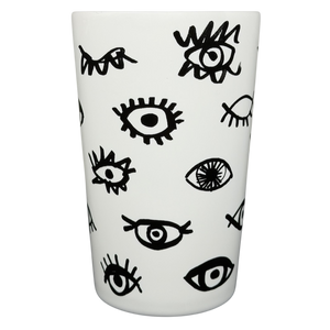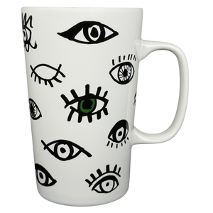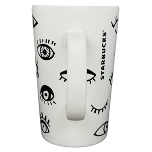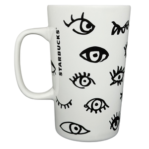This 16-ounce Starbucks ceramic mug features a playful black-and-white illustrated eye motif that wraps around the exterior, creating a bold, graphic look with a whimsical, modern feel. The tall, gently tapered shape and sturdy white handle provide a comfortable grip for daily coffee or tea, while the smooth white interior keeps the design clean and versatile. Finished with a clearly marked base confirming its 16 fl oz capacity, this mug is microwave and dishwasher safe and offers a distinctive artistic style paired with recognizable branding from Starbucks Coffee Company.