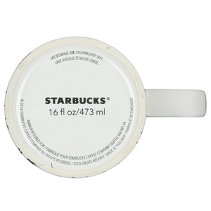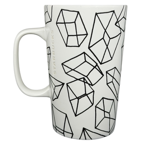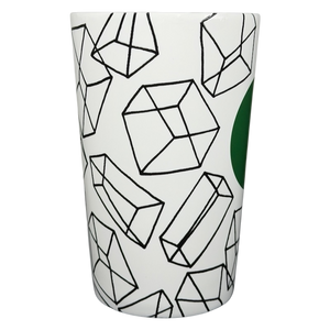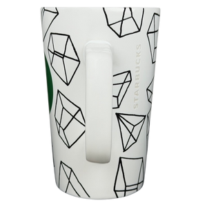 This 16-ounce Starbucks ceramic mug features a modern graphic design of hand-drawn black geometric shapes scattered across a clean white surface, accented by a bold green circle that adds a striking focal point. The tall, gently tapered silhouette and smooth white handle offer a comfortable grip for everyday coffee or tea, while the minimalist white interior keeps the look crisp and versatile. Finished with a clearly marked base confirming its 16 fl oz capacity, this mug is microwave and dishwasher safe and delivers a contemporary, design-forward aesthetic paired with recognizable quality from Starbucks Coffee Company.