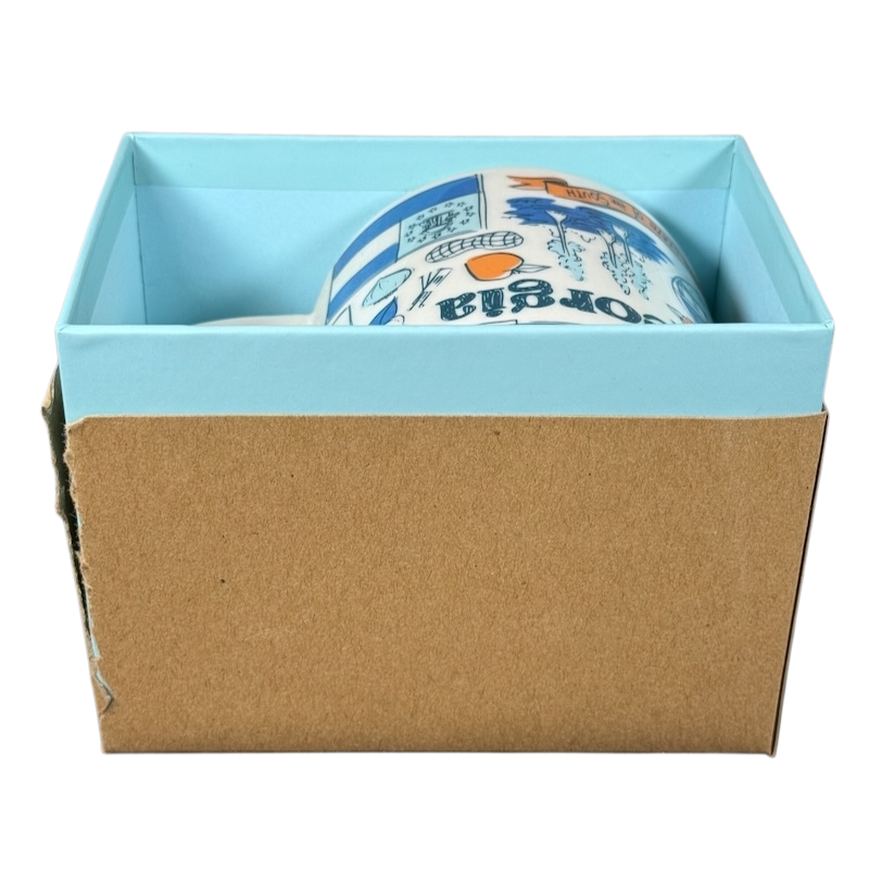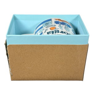 Copy 1: This mug appears unused with its original sticker still on its bottom surface and in its original box. This mug has no chips, cracks, scratches, stains or crazing. The box is in very good to excellent condition with some minor creasing.