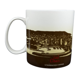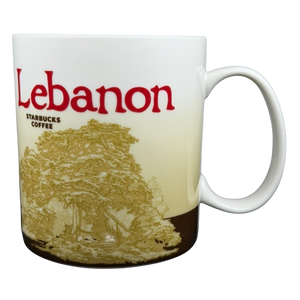 This official Starbucks Collector Series Lebanon ceramic mug features a detailed wrap-around design that beautifully showcases the cultural heritage and stunning landscape of the country. The exterior highlights a majestic cedar tree, the national symbol of Lebanon, alongside a panoramic view of a coastal city nestled against rolling mountains. Inside, the mug is finished with a sophisticated deep brown glaze that creates a refined contrast with the cream-colored ceramic body and vibrant red "Lebanon" lettering. With a generous 16-fluid-ounce capacity, this durable stoneware piece is both microwave and dishwasher safe, making it an essential addition for travelers and collectors of the Global Icon series.