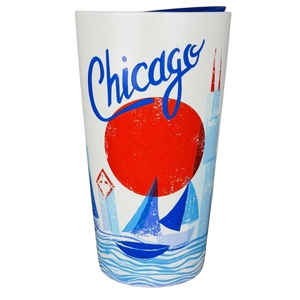 This Starbucks 12 fl oz ceramic travel mug features a bold Chicago cityscape design with graphic sailboats gliding across stylized blue waves, a striking red sun, and an abstract skyline inspired by the city’s iconic architecture. The crisp white exterior is accented with vivid blue and red tones, paired with a glossy light interior and a vertical Starbucks logo panel. It is finished with a coordinating blue plastic sip-through lid with a small vent hole for convenient on-the-go use, making this a clean, modern city mug that blends travel-inspired style with everyday functionality.