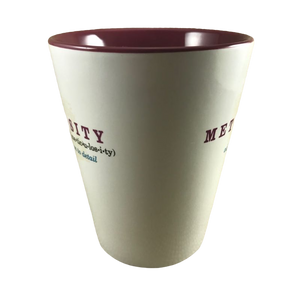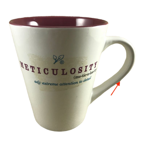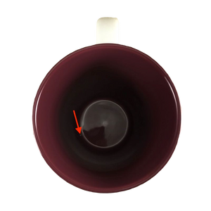 Condition note: there is a hint of wear on the bottom rim, please see the last photo for a look. Inside the mug on the bottom surface there is a small white spot where the interior color is absent. Please see the 5th photo where a red arrow is pointing to this. There is a small blemish on the handle, please see the red arrow pointing to this in the last photo.