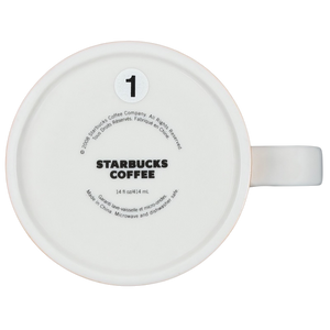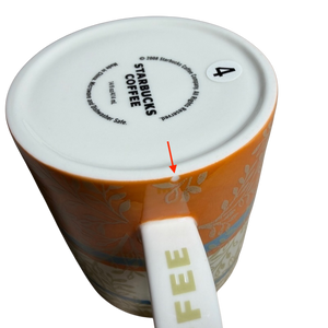 Copy 4: This mug is pre-owned and reconditioned. This mug has no chips, cracks, scratches, stains or crazing. There is a small nick on the lower edge near the handle, please see the red arrow pointing to this in the last photo. This particular copy has "STARBUCKS COFFEE" printed vertically on the handle.