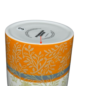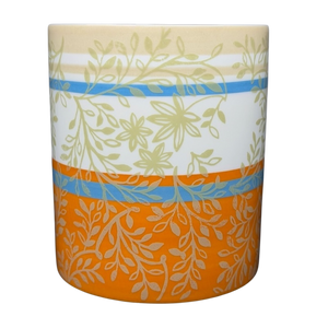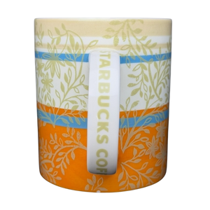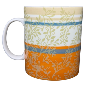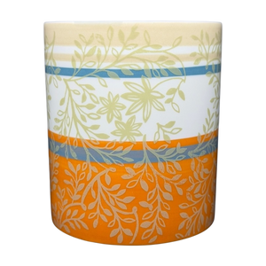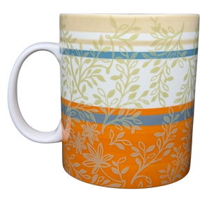 This charming ceramic mug features a warm, inviting design that blends soft botanical motifs with bold, modern color blocking. The exterior is decorated with delicate leafy vines and floral silhouettes layered across horizontal bands of creamy ivory, pale sage, muted blue, and a rich burnt orange base. The contrast between the airy, nature-inspired pattern and the saturated orange lower section gives the mug a cheerful yet refined look that feels both contemporary and timeless. The interior is accented by a subtle botanical vine detail near the upper rim, echoing the exterior artwork for a cohesive, thoughtfully designed look. A smooth white handle complements the design and provides a comfortable grip, making it ideal for everyday use.