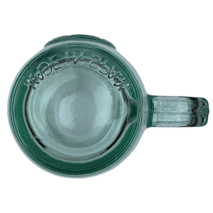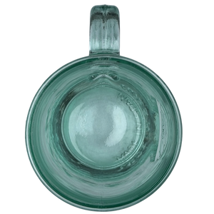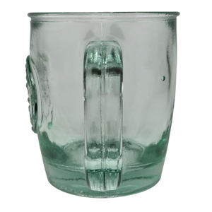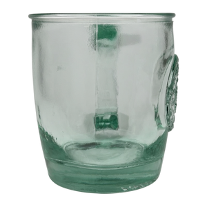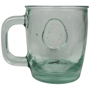 This Authentic Recycled Glass Mug combines rustic charm with eco-friendly craftsmanship, featuring a distinctive pale seafoam tint characteristic of high-quality Spanish glass. Each piece showcases a circular embossed seal on the front and a sturdy, thick-set handle designed for a comfortable grip during daily use. The bottom of the vessel is clearly marked with its Spanish origin, emphasizing its artisanal roots and durable, thick-walled construction. Its slightly textured surface and organic clarity make it a versatile addition to any sustainable kitchen collection, perfect for serving both warm and cold beverages with a timeless, industrial aesthetic.
