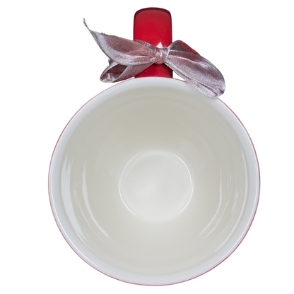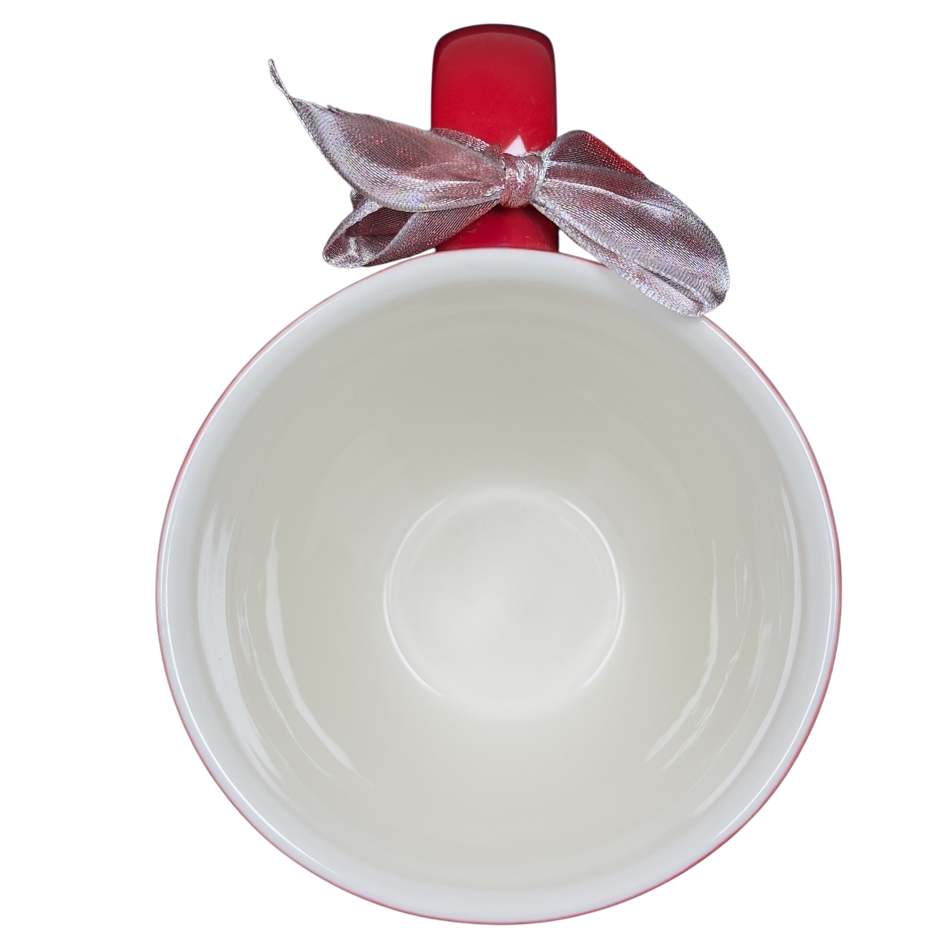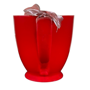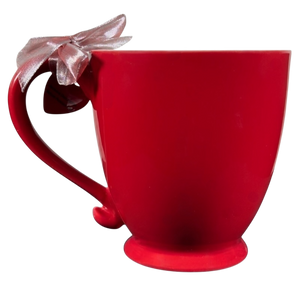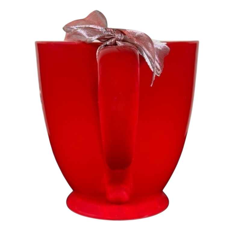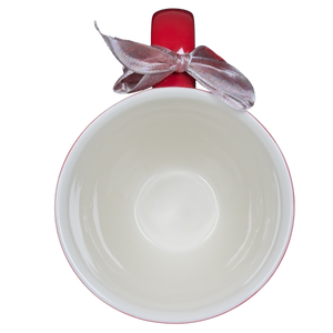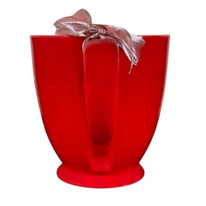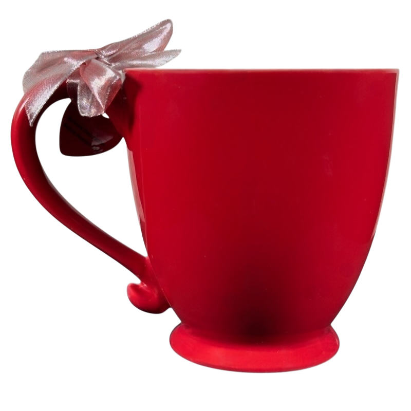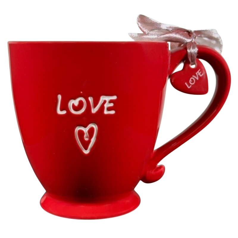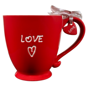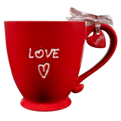 Also has a ceramic charm that says "LOVE" hanging from a pink ribbon on the handle.