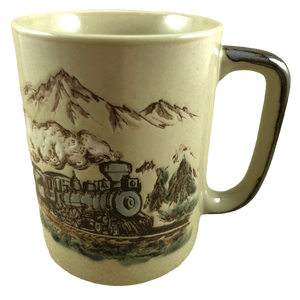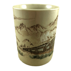 Features beautiful lightly embossed artwork wrapping around its exterior surface depicting a steam locomotive with mountains in the background behind it.