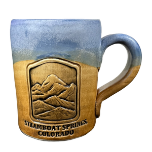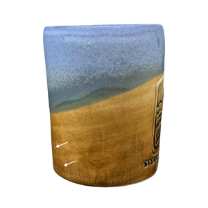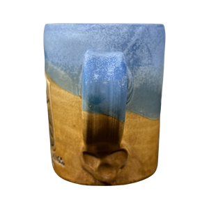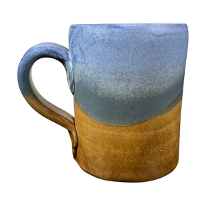 This mug has a two tone design with the majority of it being tan and the upper portion being light shades of purple. The light purple portion continues on to the upper part of the handle and the entire interior.