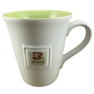 Features an embossed square on its front surface with an image of a tea bag steeping in a mug on it.
