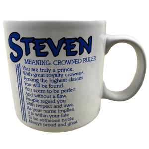 Features the name STEVEN printed in a large font at the top of the front side of the mug. Directly underneath this is a poem about the name STEVEN.