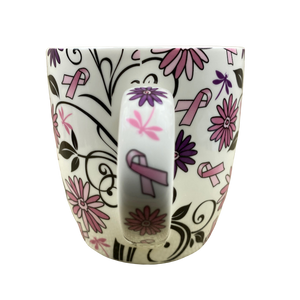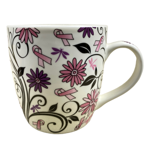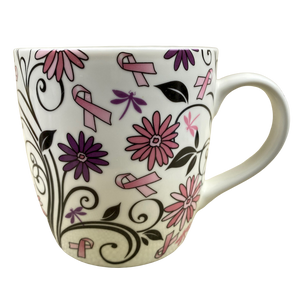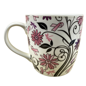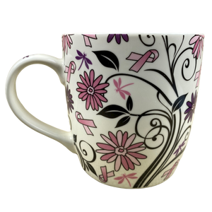 Features flowers with stems, ribbons and dragonflies wrapping around its exterior surface and on the handle.