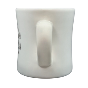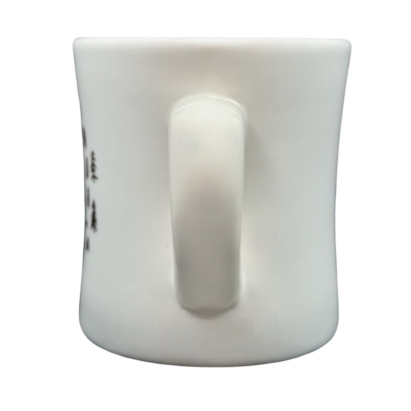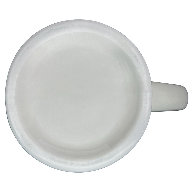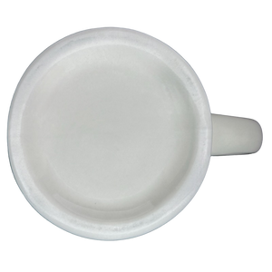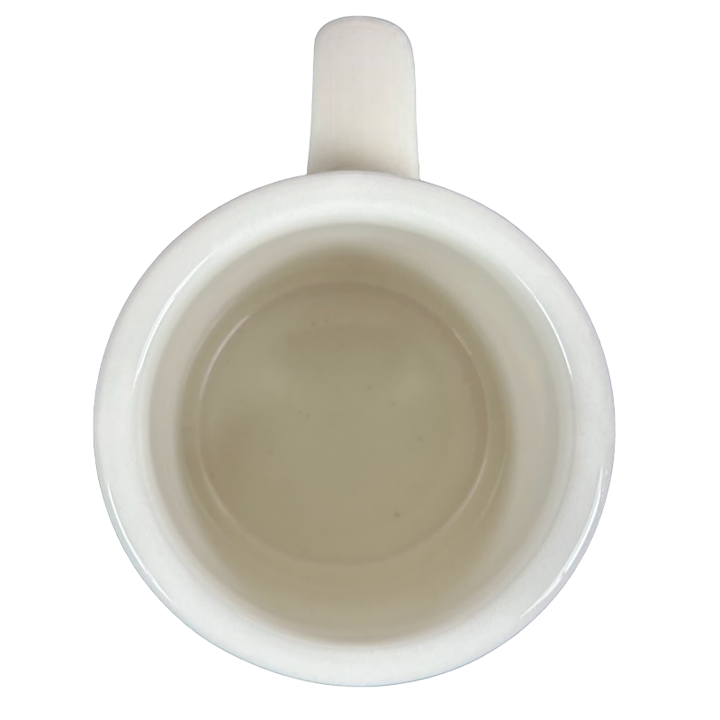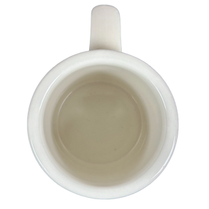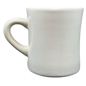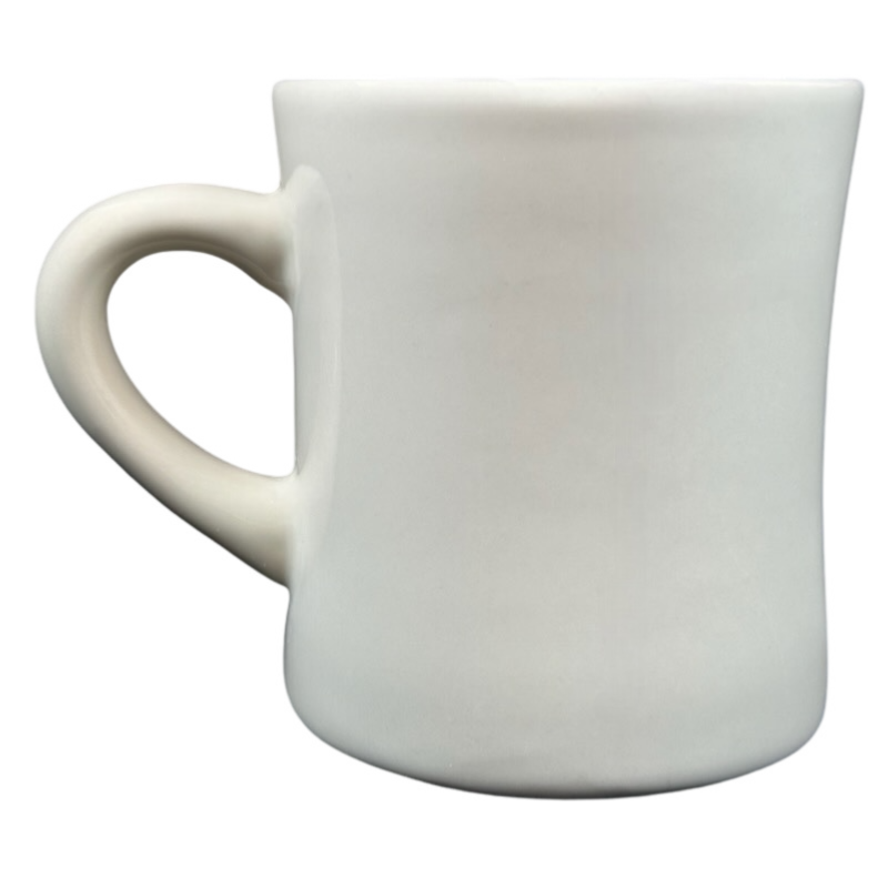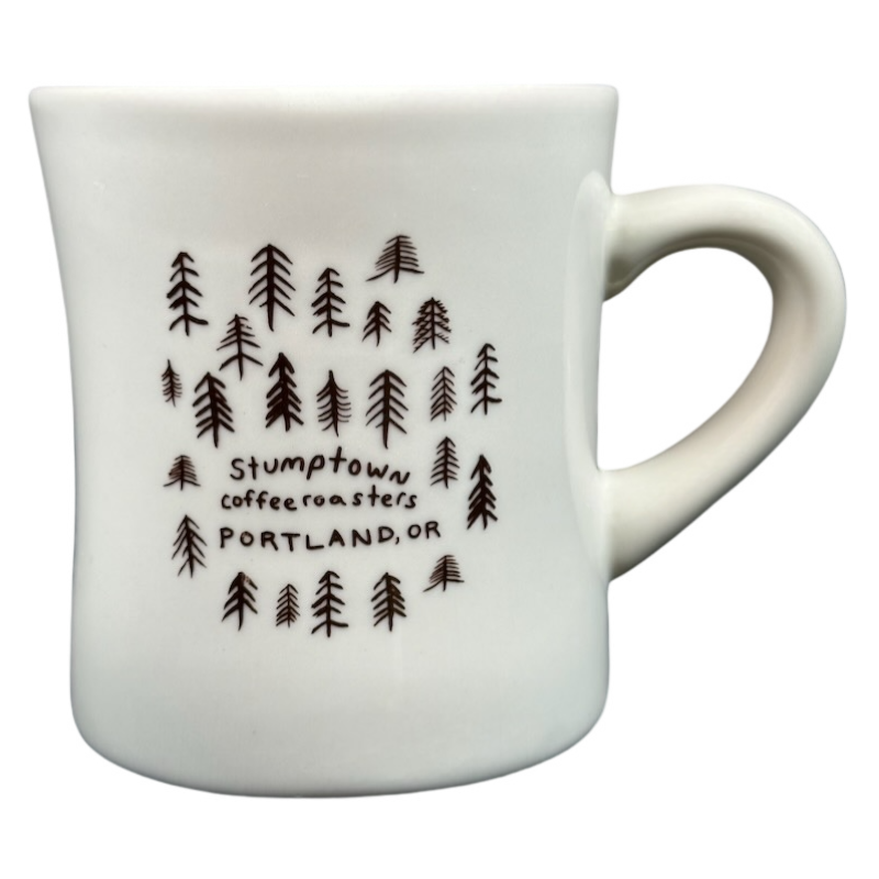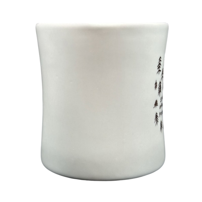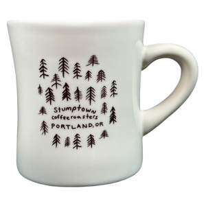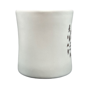This is a heavy diner style mug that features a ring composed of pine trees on its front surface.