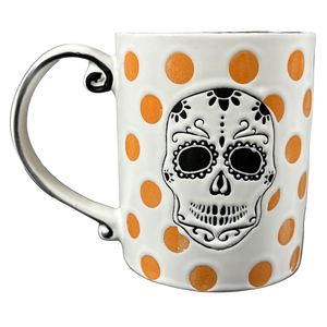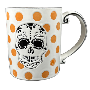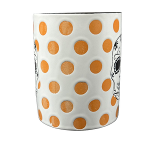 Surrounding the skull are lightly etched orange polka dots.