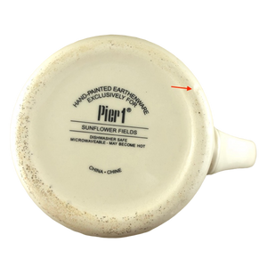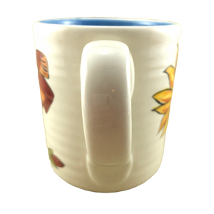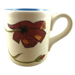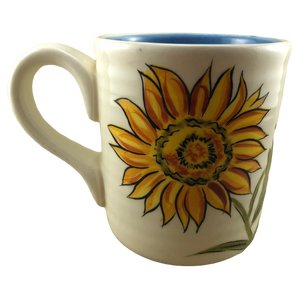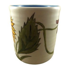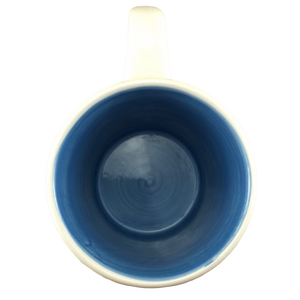 This mug is hand painted. The interior is finished in a blue swirl pattern.