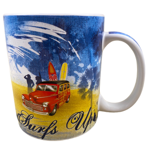 Printed in a large blue cursive font on the front lower surface is "Surfs Up."