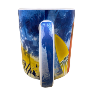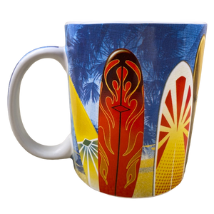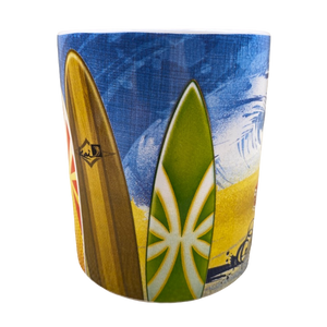 Features colorful artwork wrapping around its exterior surface and on the handle depicting surfboards and a Ford Woodie in a beach scene with waves.