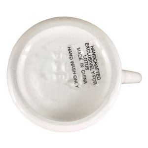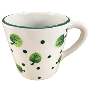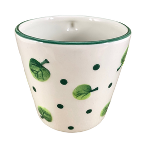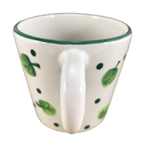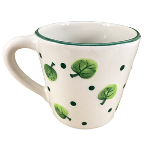 This mug features lightly embossed leaves and polka dots wrapping around its exterior surface.