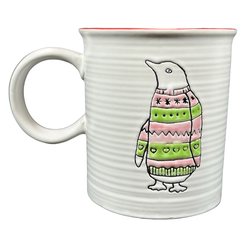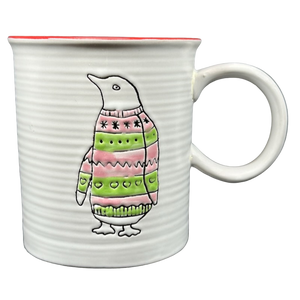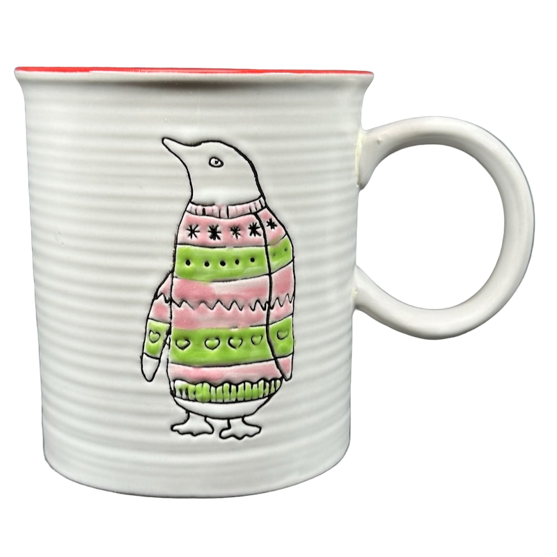Features the same artwork on its front and rear surface depicting a penguin wearing a striped sweater.