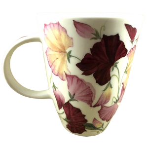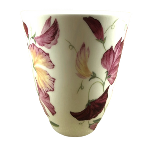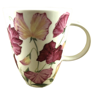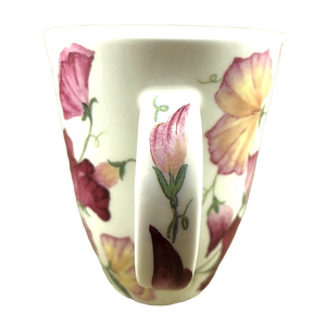 This elegant mug features artwork depicting Sweet Pea flowers wrapping around its exterior surface and on the handle.