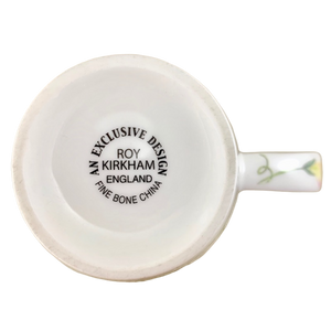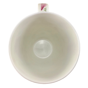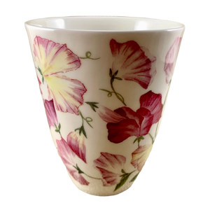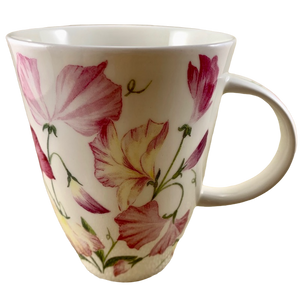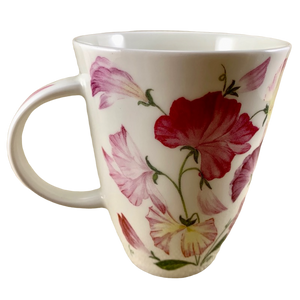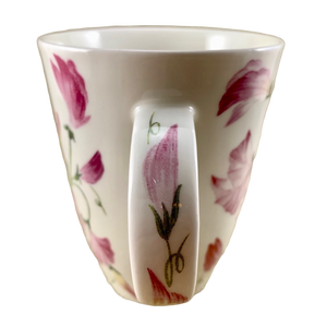 This elegant mug features artwork depicting Sweet Pea flowers wrapping around its exterior surface and on the handle.