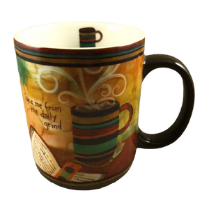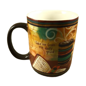 To the left of the cup of coffee is printed "Take me from the daily grind"
