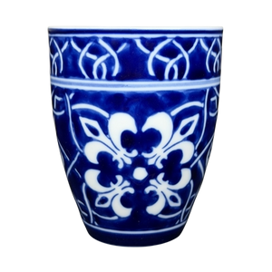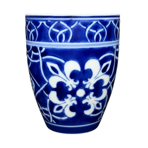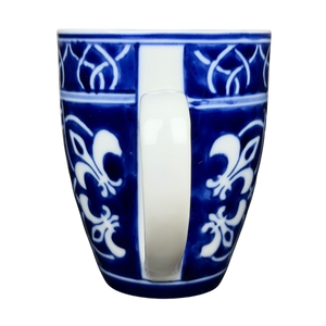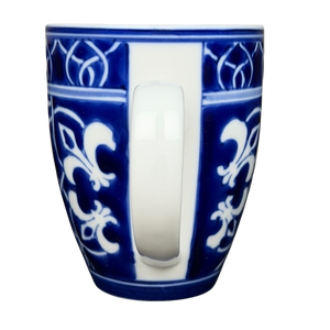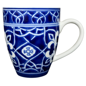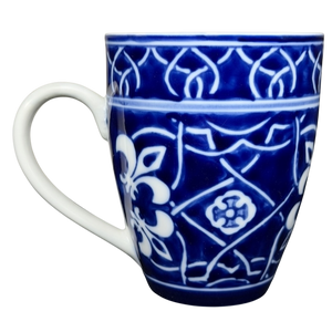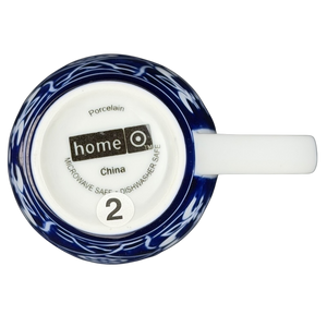 This porcelain mug features a striking cobalt blue and white pattern inspired by traditional tile and floral motifs, creating a bold yet timeless look that wraps the entire exterior. The gently tapered shape, smooth white handle, and crisp white interior offer a comfortable, everyday feel while highlighting the rich contrast of the detailed design. Marked on the base with the Home brand and Catalina designation, this mug blends classic decorative style with practical usability, making it a versatile addition to both modern and traditional mug collections.