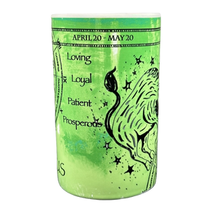 Features interesting artwork relating to the zodiac sign Taurus wrapping around its exterior surface.