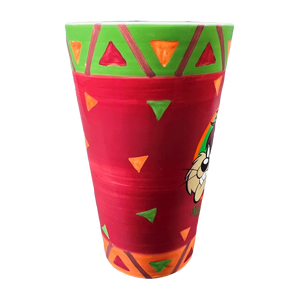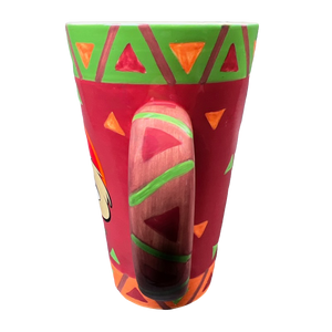 There is abstract artwork surrounding Taz and wrapping around the exterior surface and on the handle.