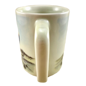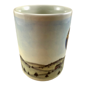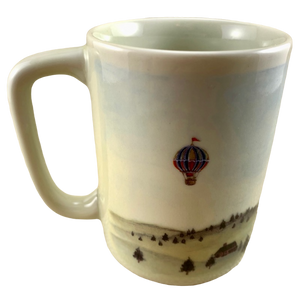 This adorable and vibrant mug features 4 teddy bears flying in a hot air balloon over the rolling hills of a countryside on its front surface.