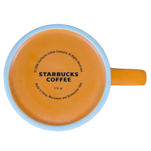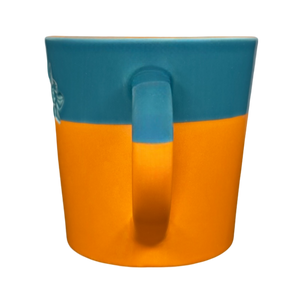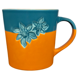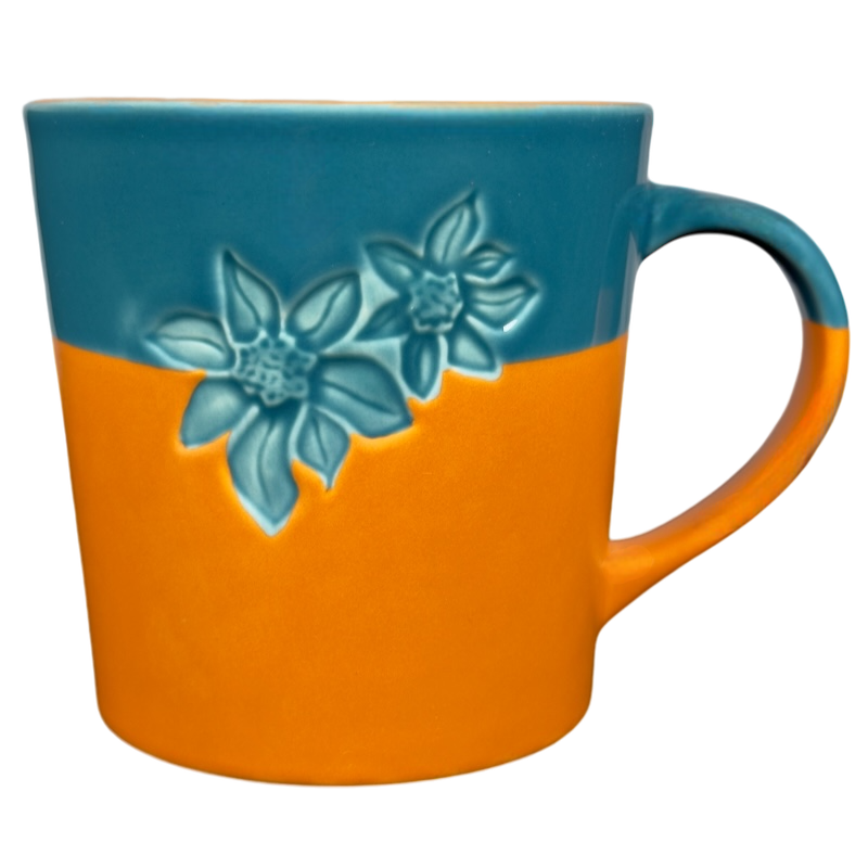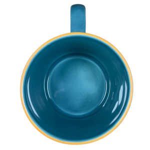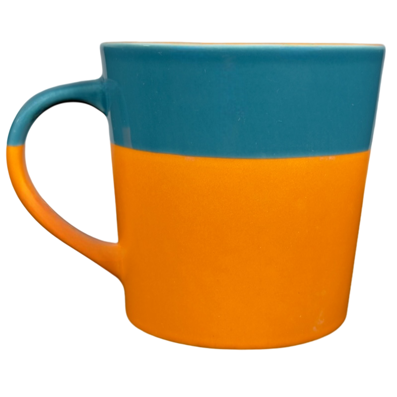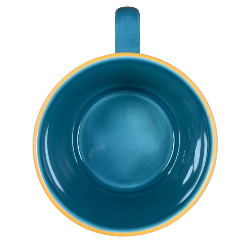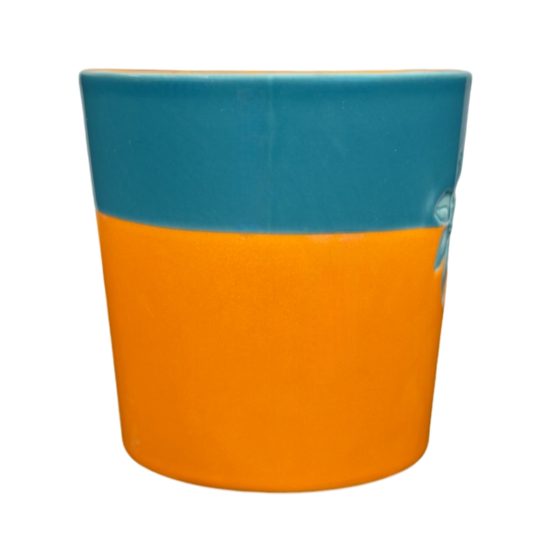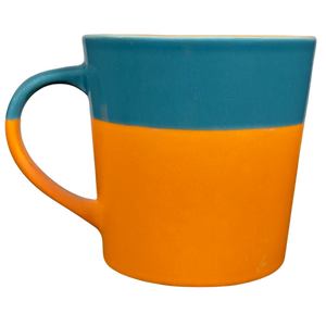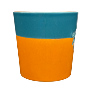 Also features a two tone design on the exterior and handle, the upper 1/3 is blue and the lower 2/3 are terra cotta.