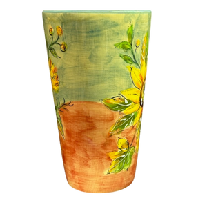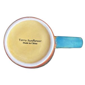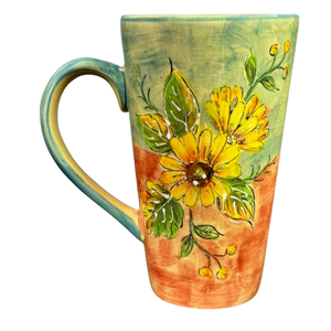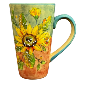 This beautiful mug features artwork wrapping around its exterior surface depicting sunflowers and leaves.