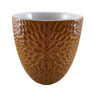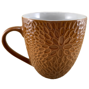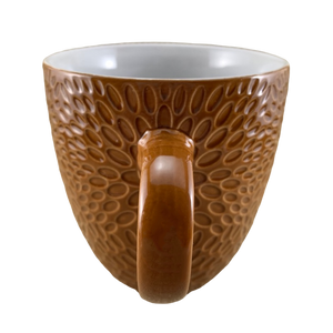This mug has a pattern of textured ovals completely wrapping around its exterior surface.