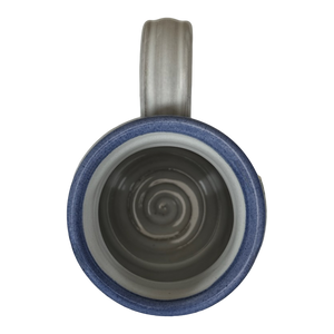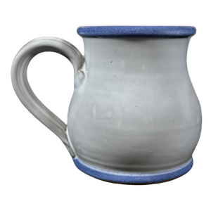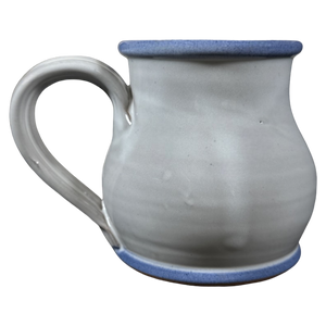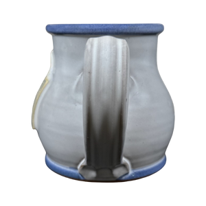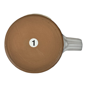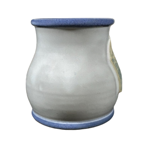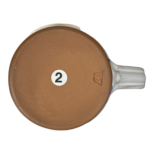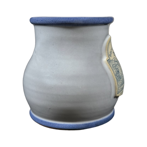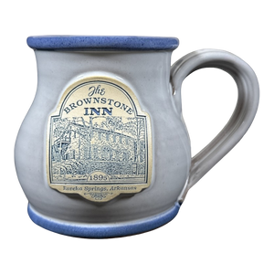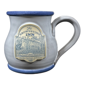 This is a hand thrown pottery mug that features a raised plaque on its front surface with an image of The Brownstone Inn located in Eureka Springs, Arkanasa.