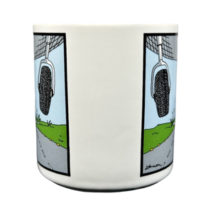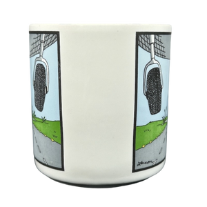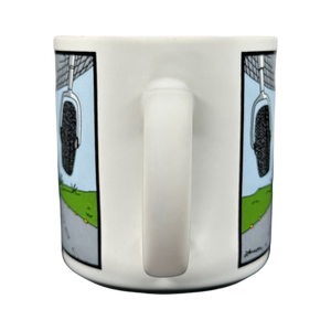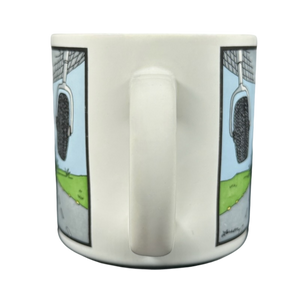 Copy 2: This mug is pre-owned and reconditioned. This mug has no chips, cracks, scratches, stains or crazing. The paint on the interior bottom surface is not applied evenly. This results in the bottom surface not being uniformly white. Please see the fifth photo. There are some tiny black dots on the interior bottom surface, please see the fifth photo. There is a faint line that runs across the grey road on the front and rear surface. It's very difficult to see in the photos and not that noticeable in person either.