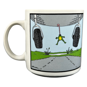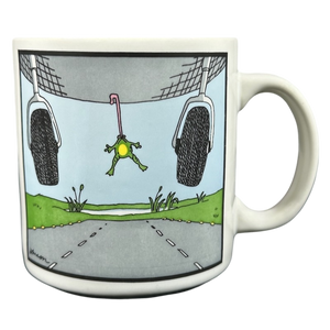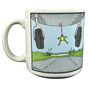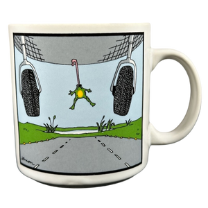 Features the same image on its front and rear surface consisting of a frog stuck to the bottom of an airplane hanging by its tongue.
