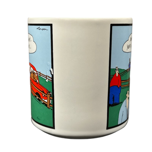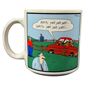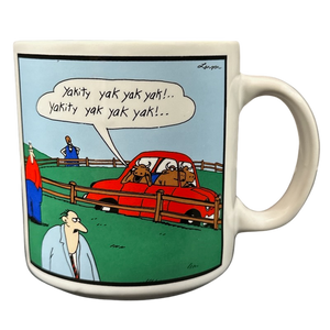Features the same image on its front and rear surface consisting of 3 yaks driving in a red car and yelling the following out the winder: