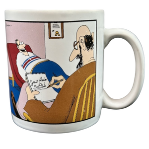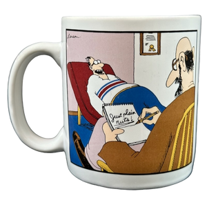 Features the same artwork on the front and rear surface consisting of an image of a psychiatrist with a patient. The psychiatrist is writing on a pad of paper, "just plain nuts!"