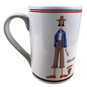 Features the same artwork on its front and rear surface depicting a woman holding a spade standing next to potted flowers.
